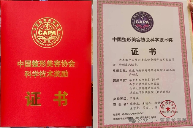 2026 年 3 月 21 日,第六届中国整形美容协会科学技术奖颁奖大会在北京万寿宾馆隆重举行。三甲医院济南市第三人民医院整形美容瘢痕中心首席专家、济南蔡景龙医疗美容门诊部创办人蔡景龙教授带领核心团队,凭借《瘢痕与瘢痕疙瘩的系统综合动态治疗研究》项目,荣获科学技术三等奖,标志着我国瘢痕综合防治领域再添权威科研成果。
